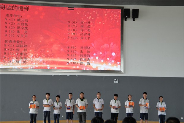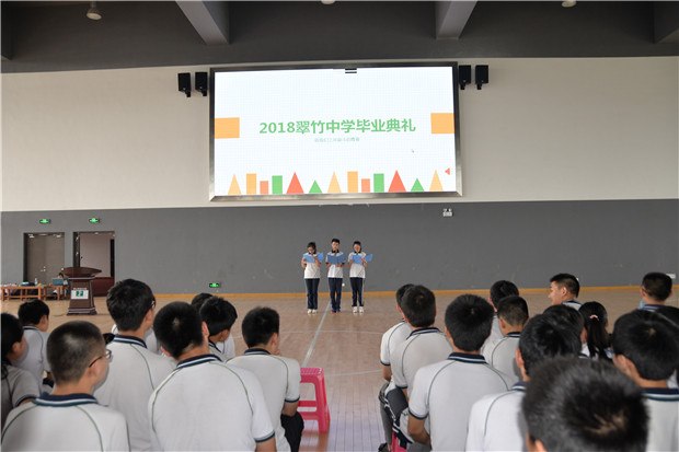 6月29日下午两点,常州市翠竹中学2018届毕业典礼在虹景中学过渡校区体育馆拉开帷幕。从这一刻起,九年级的同学们结束了三年的学习历程,正式从初中毕业。 栀子花开的六月,是伤感的六月,因为她伴随着离别。熟悉的旋律中,同学们带着激动的心情走进体育馆,在视频和图片的带领下中回顾过去三年的时光,谈笑间尽显怀念不舍。那一千多个日子里的欢笑、泪水,那青春中铭刻的倔强、叛逆,终化为离情依依。 栀子花开的六月,是感恩的六月,因为她伴随着成长。走过中考,回望三年,有那么多需要感谢的人,感谢班主任老师的引导,是迷茫时的一盏灯;感谢任课老师的付出,是前行时的一股助力;感谢同伴的帮助,是前行路上拉着你的一双手;感谢父母的陪伴,是背后默默的支持;感谢自己的不放弃,跌倒后一次次爬起……因为成长,所以懂事;因为懂事,所以感恩!同学们用献花和朗诵的形式表达对老师的感谢,最后一次聆听班主任老师的谆谆教导。 栀子花开的六月,是希望的六月,因为她伴随着出发。中考结束,初中毕业,并不意味着结束,而是昭示着开始。我们相聚在这个六月,我们相约在充满希望的未来。 整台毕业典礼隆重但不繁琐,简约而不简单,所有环节的设计,大到典礼的构思,环节的安排,小到单个节目的准备,PPT的制作,无不凝聚着毕业生们的巧思。在毕业生代表的自导自演之下,给全体九年级老师和同学带来了一场难忘的毕业典礼。