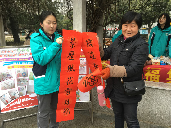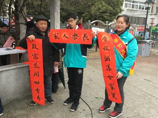 迎新春,送春联,是馨竹志愿者暖冬行动的一项传统服务项目。孩子们挂着兴奋又紧张的笑容,大笔挥毫,龙飞凤舞,一幅幅洋溢着新年喜气的春联跃然纸上。“喜居宝地千年旺福照家门万事兴”“梅传春信寒冬去,竹报平安好日来”……厚厚的一叠红纸上浸满了我们浓浓的节日祝福。虽然冒着细雨,但寒风下志愿者们顾不上微微冻红的小手,认真书写的模样、稚嫩却工整的字迹,那一幅幅红彤彤、散发浓浓墨香的春联,得到了过往居民的阵阵夸赞与好评。