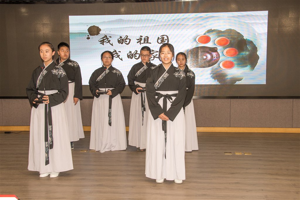 在朗诵中,同学们将文字的诗情一一传达:悠久的中国、渊博的中国、悲壮的中国、坚毅的中国、奋斗的中国、崛起的中国、温馨的中国……在各异的音乐渲染中,特色的服装、特别的道具、特异的背景,各班同学们纷纷展示了他们心中多彩的中国。荣获“最美吟诵奖”的班级更是出类拔萃:双排键的现场弹奏配上领诵齐诵的多元形式,气势恢宏赞美中华;以革命者手稿为题材,配合独出心裁的褴褛的囚衣,沉郁的语调把我们带回了那个战火纷飞的血色年代;屈辱与反抗并存的故事在清亮的声音中娓娓道来,近代史的画卷缓缓铺开。