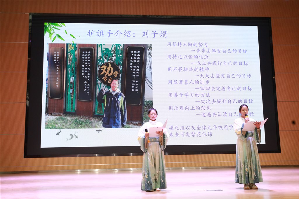 【班级介绍】 八四班这个团结友爱的大集体由25位女生与20位男生组成。共同的目标,使我们走到一起,铸就了八四班这个充满自信、充满活力、积极向上的班级体。“望窗外云卷云舒,看门前花开花落”每每经过,总能看见一些同学在教室里认真自习,激烈讨论。镌在墙上的勤奋,是他们的写照;放学后,橙色的灯光下也总能看到同学勤劳的身影……“宝剑锋从磨砺出,梅花香自苦寒来”愿他们以星星之火助燃梦想之光,向梦想奔赴而来。 护旗手1(介绍) 刘梦娣,我们班的英语课代表。她是一个乐思善学的活泼女孩,为人正直,友善,乐于助人。在平时的学习中,她立志像《白杨礼赞》中的白杨树一样:力求上进,坚强不屈,朴质严肃。她时时激励自己,努力在各方面精益求精,没有最好,只有更好。“书山有路勤为径,学海无涯苦作舟”希望她能像诗中所说,通过自我的努力,更上一层楼。 护旗手2(介绍) 嵇丞昊,我们班的劳动委员和语文课代表。他活泼开朗,乐于助人,热爱劳动,在平时的学习生活中专心致志,力求上进。他立志学习竹文化,贯彻五竹精神,做一个虚心有气节的人。他的座右铭是:“做人当有气节,不随波逐流;虚心向学,知之为知之,不知为不知,是知也。”希望他可以不断勉励自己,竹根立定,做一名真正的谦雅君子。 初入冬季,天气微寒,我校将于12月5日至7日迎来新优质学校评估,这是我校的一件大事,我们应该做好哪些准备?为学校做些什么呢?章校长为全校师生进行了一场深入人心的思想动员。 首先,思想就位,做到心中有学校,行动践大局,向上生长,让新优质的底气更足。其次,履责于行,向下扎根,以“功成不必在我”的胸襟和“功成必定有我”的担当,踏实前行,让新优质的脚步更稳! 续写翠中未来,我辈任重而道远。愿各位同学借迎接新优质评估的契机,都能在属于自己的青春赛道中书写最美的芳华!