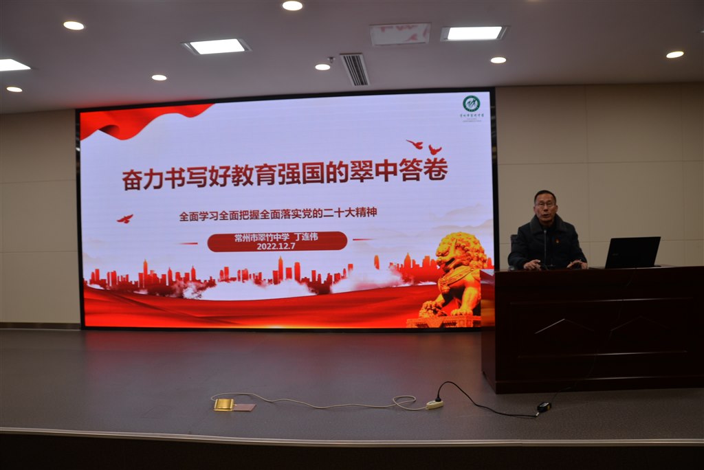 为进一步领会党的二十大的精神实质和丰富内涵,推动学校学习宣传贯彻活动走深走实,写好教育强国的翠中答卷,12月7日下午,常州市翠竹中学在报告厅组织学习贯彻落实党的二十大精神宣讲会。党总支书记丁连伟作《奋力书写教育强国的翠中答卷——全面学习把握落实党的二十大精神专题宣讲,翠竹中学全体教职工参加。