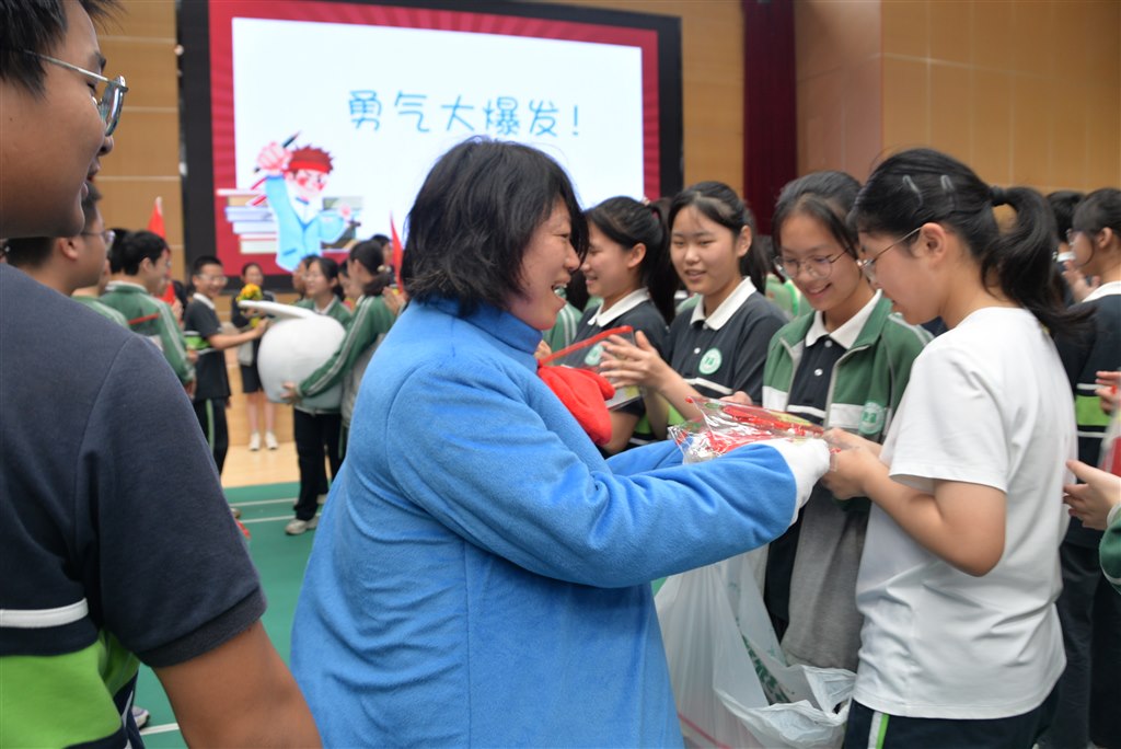 随着音乐的转变,十位卡通人物纷纷现身舞台,在歌声中摇摆着笨拙的身躯,逗得在场同学哈哈大笑。在同学们欣喜好奇的目光中,卡通人物们走到了同学们的队伍中,为每一个学子发放翠中专属的中考爱心包。按捺不住好奇,有的同学偷偷摘下十位卡通人物的头套,就知道是他们!只有他们,肯在如此炎热的天气,为孩子们穿上厚厚的服装;只有他们,愿在忙碌的工作放下一切,只为给孩子们惊喜,他们,是我们最亲爱的班主任!