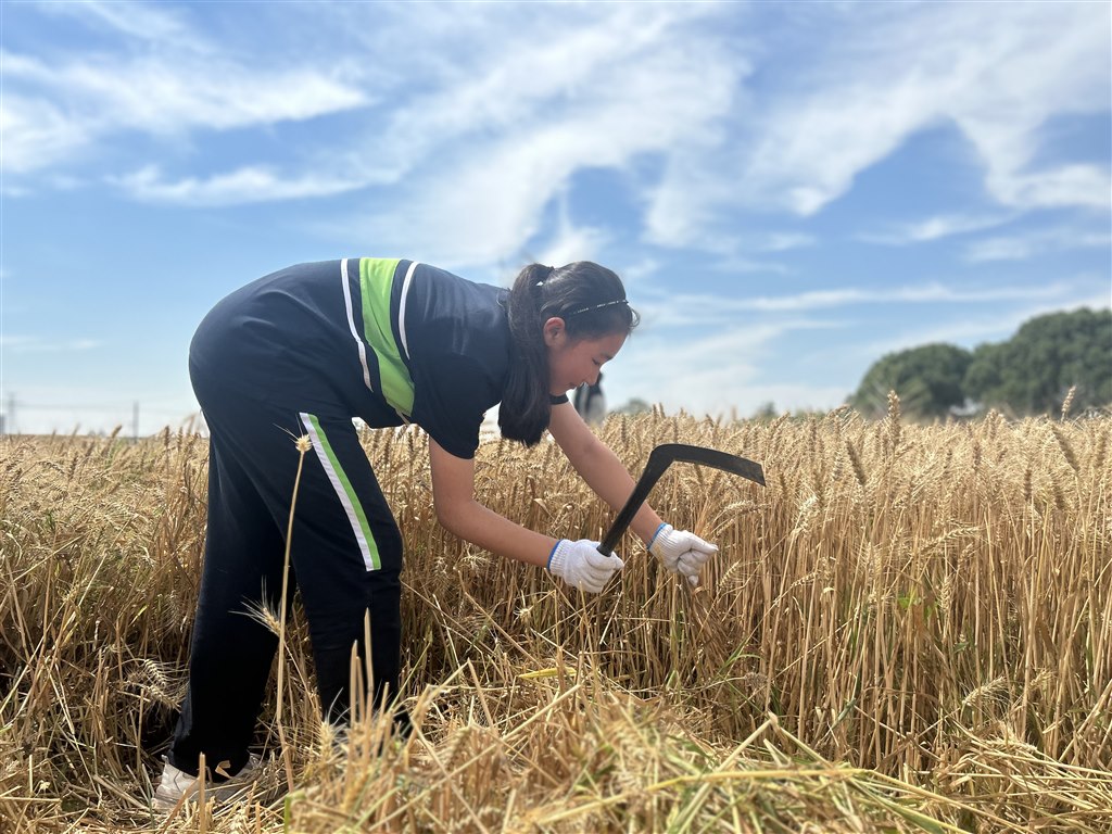 蓝天的映衬下,白云悠闲地漂浮,微风拂过,带着丝丝暖意,穿过翠绿的树梢,为世界增添了一份新的生机。今天,学校组织了一次研学活动,与大家同行,开启了一次别开生面的割麦子活动。我静静地站在金黄的麦田里,随着风,麦浪层层叠叠,闭上眼,似乎嗅到了一丝丰收的喜悦。初下田地,小心翼翼地迈开第一步,寻找一颗饱满的麦穗,握住麦穗,用镰刀轻轻一拉,伴着淡淡的麦香味,就收割完成了一株了,熟能生巧,渐渐的,路旁已堆满了小山似的小麦,令人成就感满满。一眨眼,一个下午就这样度过,看着手里的镰刀,擦着满头的汗珠,在劳动中体味到了难以收获的幸福,更明白了粒粒皆辛苦的道理。——七8刘可贞