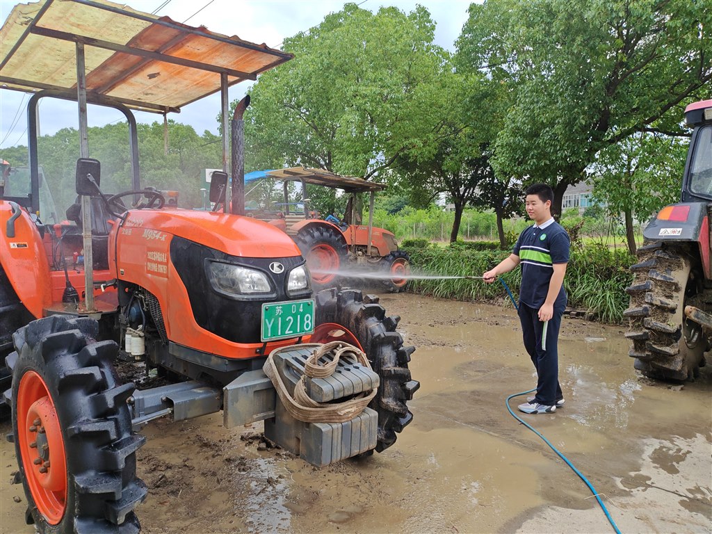 在机库中,学生们亲眼见到了现代化的农机设备,并在专业人员的指导下学习了农机的基本维护和保养方法。学生们积极参与,亲自擦拭农机、添加机油,不仅锻炼了动手能力,也增进了对现代农业技术的认识。