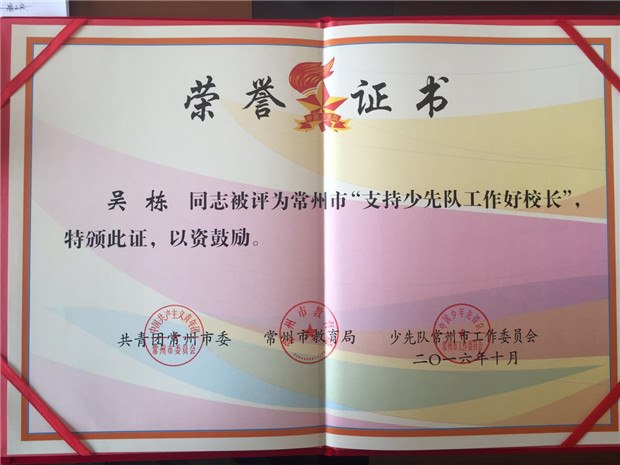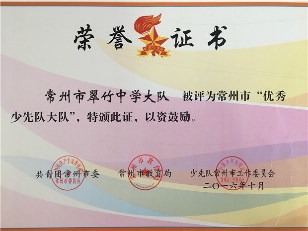 2016月29月1会上,市委书记阎立在会上寄语全市少先队员牢记使命,积极进取,奋发有为,时刻准备着为实现中华民族伟大复兴中国梦继续奋斗,早日成长为美好常州的合格建设者和接班人,让星星火炬在“强富美高”新常州建设征程中放射出更加灿烂的光芒。在本次大会表彰环节,我校获得了多项荣誉: 常州市翠竹中学大队被评为常州市“优秀少先队大队”。 吴栋校长被评为常州市“支持少先队工作好校长”。 吴栋校长荣获三级星星火炬奖章。 本次少代会的顺利召开,为我校少先队工作开展指引了新的方向。在今后的少先队工作中,我校将以市委书记阎立在少代会上寄语为目标,扎实推进工作,争取各项活动再上新台阶。(任宁)