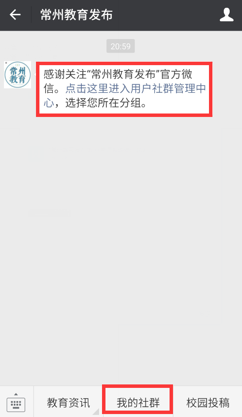 在关注“常州教育发布”后,会收到关注后的提示消息,点击即可进入用户社群管理平台,选择所在的组别后完成用户分组操作。已关注的用户,可以直接点击菜单“我的社群”或者回复关键词“社群管理”进入分组页面。
