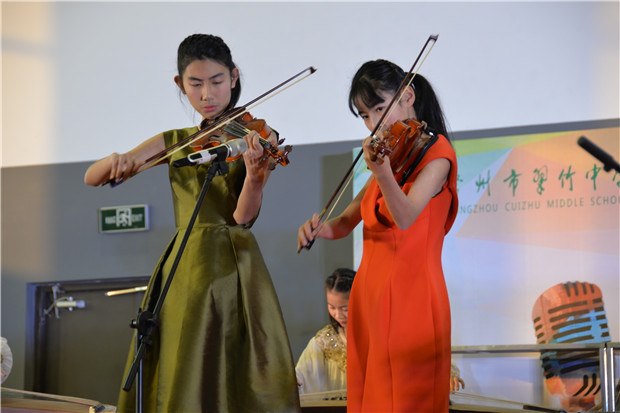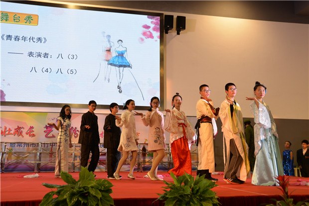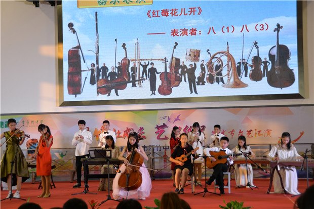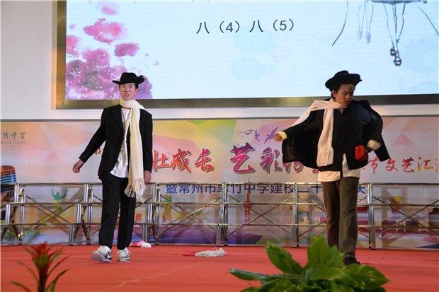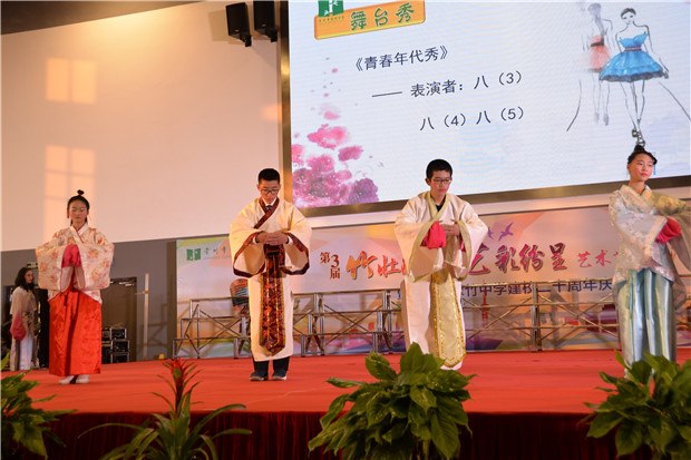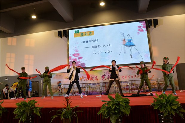 冷冬寒风凛冽,翠竹中学学子们的热情驱散了寒冷。12月26日下午,翠竹中学全体师生齐聚过渡校区体育馆,观看“竹壮成长,艺彩纷呈”艺术节文艺汇演暨二十周年校庆晚会。 恰逢学校二十周年校庆,当艺术节撞上校庆,会擦出怎样的火花呢? 我拿青春献给您 翠中二十载,二十年风雨,二十年成长;二十年辛苦播种,化作一路芬芳,化作最美翠中。最美翠中有一群最美的人,他们把最美的青春,最美的时光献给了学校。在学校二十岁生日之际,老师们也带来了朗诵,将最美的诗歌献给她!“让我怎样感谢你,当我走向你的时候,我原想收获一缕春风,你却给了我整个春天……”道不尽的感谢,说不完的爱意,就让诗歌带给学校最美的祝福。 我拿歌舞献给您 炫酷动感的街舞,热情奔放的新疆舞,活力四射的集体舞……这是一个舞蹈的世界,各色的水袖飘动着,给全体师生带来视觉上的享受!舞的是青春,舞的是活力,舞的是热情,舞的是喜悦!激昂的大合唱《我们是中国少年》传达了少年强则国强的心声,青春活力的小合唱《I just wanna run》展现了翠中学子为未来努力前行的坚定决心,情感真挚的大合唱《一千零一个愿望》更是传达了学子们对母校的无限祝福……或是激情四射或是柔婉动听歌声回荡在体育馆的上空,久久萦绕。 我拿“心艺”献给您 艺术节从11月份就拉开了帷幕,翠中学子们灵巧的双手为学校设计了吉祥物,描摹了记忆中的老校园,绘出崭新的过渡校区,刻画了老师辛勤工作的身影,挥毫泼墨一抒最真的祝愿……彩笔纵横间表现了对学校的爱意与深深的祝福! 在晚会上,八年级同学的诗音画《你好,翠中》将所有人的记忆拉回到了正在重建的翠中老校园。还是在那樱花树下,还是在小池塘旁,还是那个幽长的连廊,同学们轻声诉说着快乐美好的校园生活,诉说着对学校最深的祝福。 我拿“创艺”献给您 翠中二十载,我们从相片里看到时光划过的痕迹。八年级同学脑洞大开,用服装的变迁来展现时代的特色。从古时的汉服到近代旗袍中山装,再到上世纪的军装新时代的潮服,搭配逗趣的音乐,精彩的表演,让台下的观众笑声连连,捧腹不已心,掀起了演出的高潮。时光匆匆,蜘蛛侠也来到了舞台上,小品《时间去哪了》引得同学们不住的拍手称赞。 “竹壮成长,艺彩纷呈”艺术节文艺汇演已连续举办三届!这是一个学生们大显身手的舞台,主持、唱歌、跳舞、绘画、乐器……个个都秀出自己的才艺!这是一个彰显青春活力的舞台,无论是活力四射的歌舞,还是创意十足的小品年代秀,处处都展现了翠中学子们的无限创意!这是一个饱含真情的舞台,当艺术节遇上了20周年校庆,学生用青春朝气向学校送上祝福,老师们用默默付出对学校道一声感谢!最真、最美的祝福送给您——我们的翠竹中学!