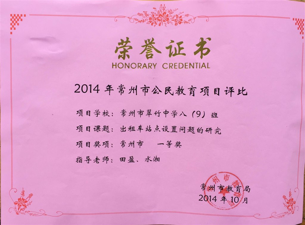 田盈、水湘老师指导的《出租车站点设置问题的研究》荣获常州市公民教育实践活动项目初中组一等奖