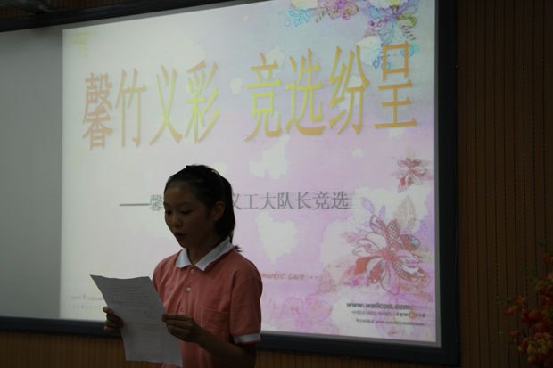 9月26日,翠竹中学八年级各班推选的十名优秀学子带着满满的爱与心中的梦想,积极参与馨竹义工队大队长竞选,在录播教室展开了一场激烈的角逐。 本次竞选采用演讲与现场答题的形式,附加各拉拉队的加油助威,多方面考察竞选者口语表达、组织领导、临场应变等能力。最终十名候选人用精彩的表现,给在场的每一位观众都留下了深刻而美好的印象。 1. 八(七)班 贺滨冰 不得不说这次“馨竹义彩”,义工大队长竞选是特别的。 我参加过很多竞选,心里总不免会有些紧张,胆怯,激动……但当“大队长”前面冠上“义工”这个温暖而又充满爱的名词,竞选就仿佛成了一个气体交换的软管,成为优秀学生间传递爱心和分享经验的盛会。 而在听完其他几位同学激情澎湃的演讲后,我的心情是无比的激动,有这么多人和我一起为所钟爱的爱心“事业”奋斗。 同时我也了解到了大家共同的想法,那就是帮助他人,手留余香。或许没有花哨的语言描述,没有惊天动地的举动,但那种爱的传递让人感到发自内心的温暖与感动。 当落叶轻轻拂过大地妈妈的脸,大地妈妈将敞开怀抱迎接着它落叶归根的孩子;当天空飘过片片云彩,留下串串云烟,太阳会调皮地将它们吹散;当我们走过一个个社区,踏过一片片土地,遥望辽阔的星空时,若忽然发现记忆里有这么多精彩,那该有多么满足与快乐。或许是自闭症孩子串串银铃般的笑声长留我们心中,或许是孤寡老人那布满皱纹的脸烙印在我们的脑海里,或许一个个我们帮助过的人和帮助过我们的人如电影般在脑中回放。 那时我们将会会心一笑。我想,义工就应该是这样的吧。