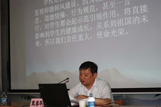 6月30日,本学年的总结大会上,我校特邀常州市教育纪工委书记戴春华来校作了题为“提高党性修养、弘扬优良作风、争做勤廉表率”专题讲座,对全体教师进行了一次全方位的廉洁从教、求真务实、艰苦奋斗的群众路线教育,全面发挥廉洁教育培育人、警示人、塑造人的重要作用,在全校教职工中营造了“倡廉崇洁”的良好氛围,得到了很好的反响。 戴书记的讲座内容从校内到校外,既有对宏观理论的解读、又有对现实问题的解剖,从以下三个方面展开:1. 提高党性修养,做政治坚定、党性优良的模范;2. 弘扬优良作风,做求真务实、艰苦奋斗的模范;3. 认清反腐形势,做拒腐防变、清正廉洁的模范。他的讲座内容生动、材料丰富、旁征博引、具有很强的指导性、前瞻性和启发性,深受大家的欢迎和好评,为我校党支部在全校进一步推进群众路线教育实践活动增强了理论、拓展了思维、开阔了视野。 戴书记最后亲切地说:“人生没有彩排,每天都是现场直播。我们每个党员干部都要时刻自警自律,认真走好人生每一步;都要时刻意识到党和人民在监督,坚持廉洁勤政,永远保持良好的思想道德情操。”引发了老师们对廉洁、廉政的思考,对今后的人生起到有效的警醒作用,进一步树立了正确的廉洁价值观,增强了为国家奋斗、为人民谋利益的信心和决心。(单斐)