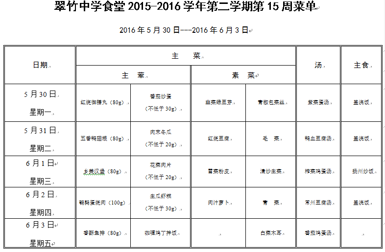 翠竹中学食堂2015-2016学年第二学期第15周菜单